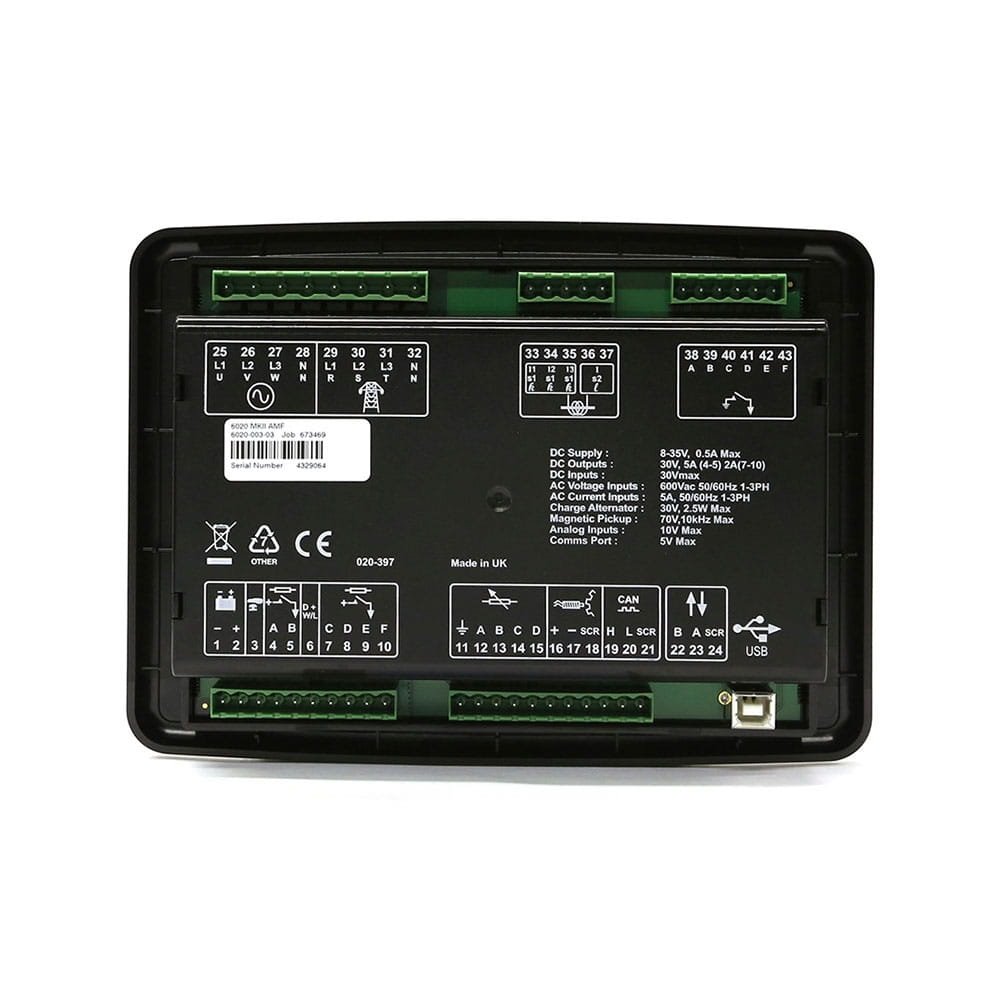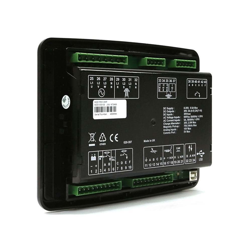 The DSE6020 MKII is an Auto Mains (Utility) Failure Control Module developed to provide a wide range of operating and monitoring features for single diesel and gas gen-sets. Monitoring engine speed, oil pressure, coolant temperature, frequency, voltage, current, power and fuel level, the modules give comprehensive engine and alternator protection. This is indicated on a large back-lit LCD icon display via an array of warning, electrical trip and shutdown alarms.