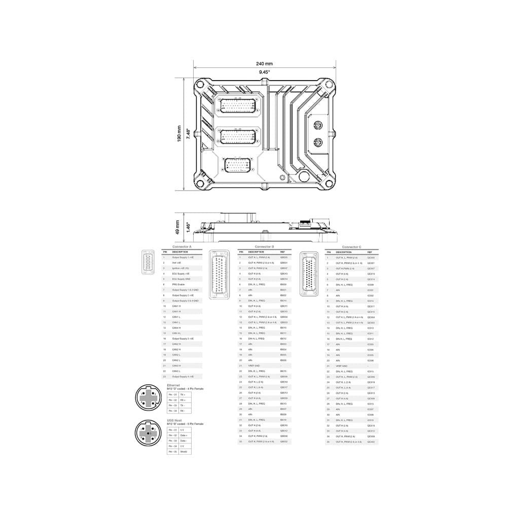 Inside the unit is a powerful 32 bit processor with a 220 MHz clock speed for outstanding operating response times. There are also 4 independent CAN interfaces, J1939, CAN Open and Raw CAN. Flexible user programming is provided via CODESYS 3.5.