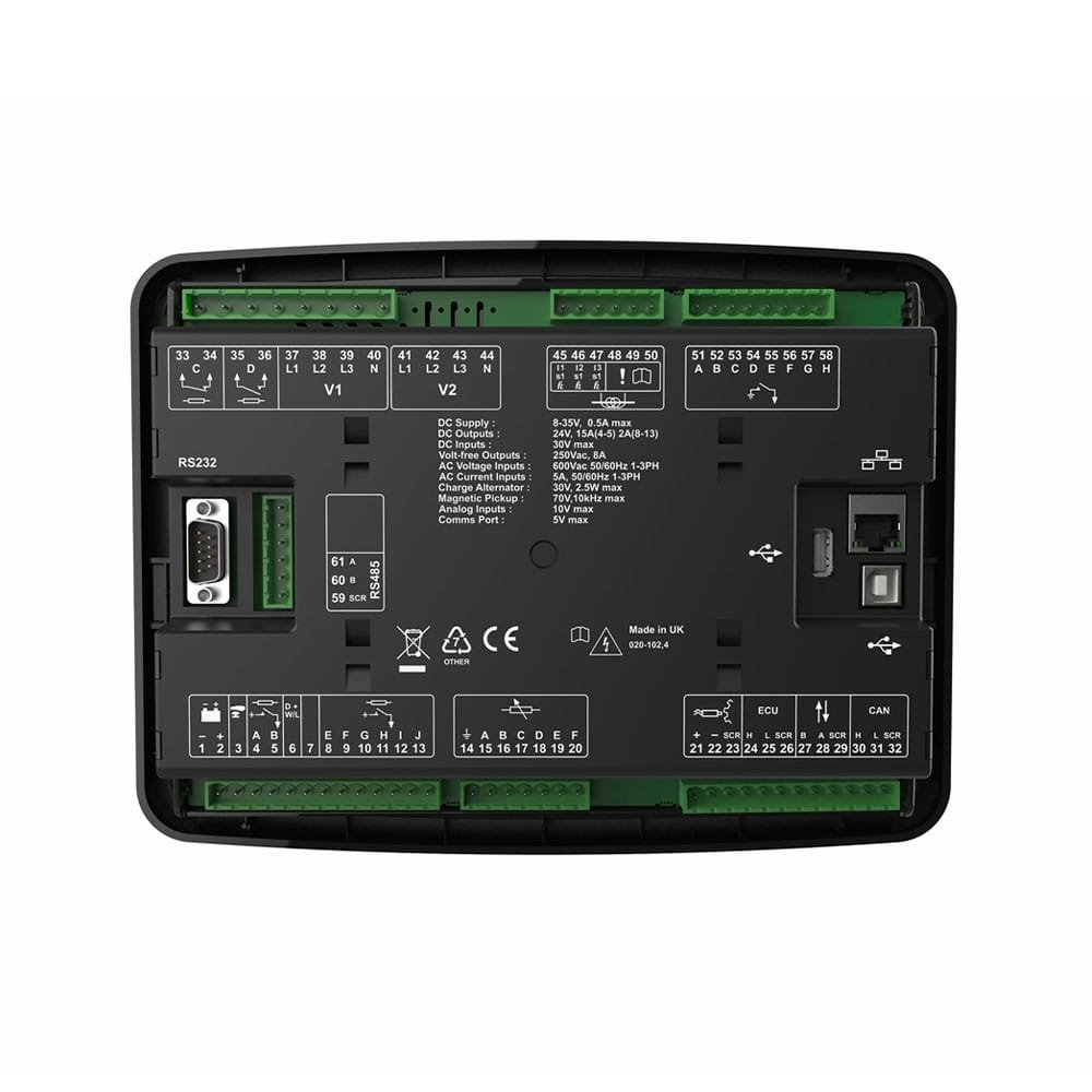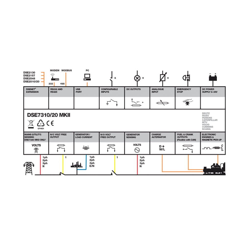 The module include USB, RS232 and RS485 ports as well as dedicated DSENet® terminals for system expansion. The DSE7310 MKII is compatible with electronic (CAN) and non-electronic (magnetic pick-up/alternator sensing) engines and offer an extensive number of flexible inputs, outputs and extensive engine protections so the system can be easily adapted to meet the most demanding industry requirements. The extensive list of features includes enhanced event and performance monitoring, remote communications & PLC functionality.