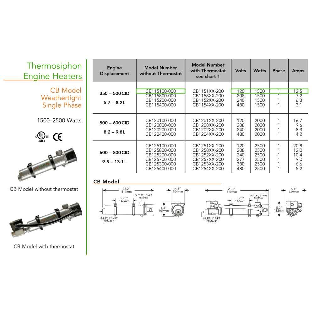 The pressure die-cast aluminum tank provides long-lasting durability in demanding environments. Each heater includes a built-in high-limit safety thermostat rated at 205°F (95°C) to ensure reliable and safe operation year after year. HOTSTART CB single-phase engine heaters support hard-wired electrical installation using rigid or flexible conduit and are available with or without optional flow-through thermostat assemblies.