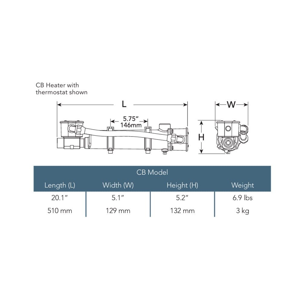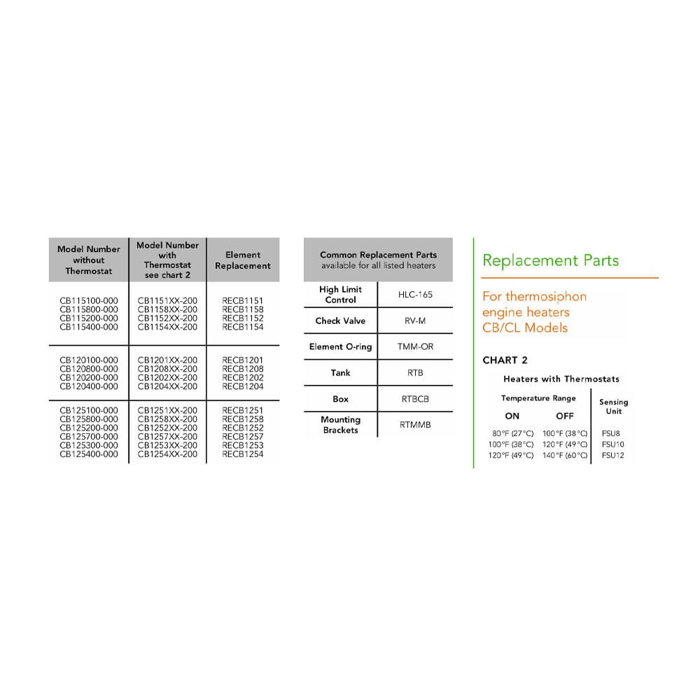 The pressure die-cast aluminum tank provides long-lasting durability in demanding environments. Each heater includes a built-in high-limit safety thermostat rated at 205°F (95°C) to ensure reliable and safe operation year after year. HOTSTART CB single-phase engine heaters support hard-wired electrical installation using rigid or flexible conduit and are available with or without optional flow-through thermostat assemblies.