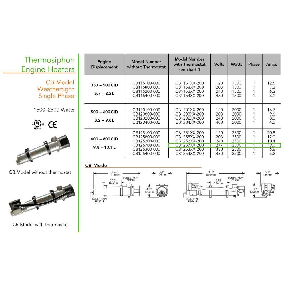 The pressure die-cast aluminum tank provides long-lasting durability in demanding environments. Each heater includes a built-in high-limit safety thermostat rated at 205°F (95°C) to ensure reliable and safe operation year after year. HOTSTART CB single-phase engine heaters support hard-wired electrical installation using rigid or flexible conduit and are available with or without optional flow-through thermostat assemblies.