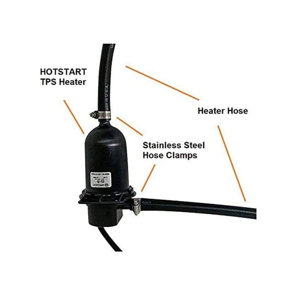 - Engine Heater Kit Includes: Original HOTSTART TPS heater | Mounting hardware | 5 feet of ⅝”- high temperature heater hose (can but cut into pieces) | 2 x Stainless steel industrial type hose clamps | installation instructions.