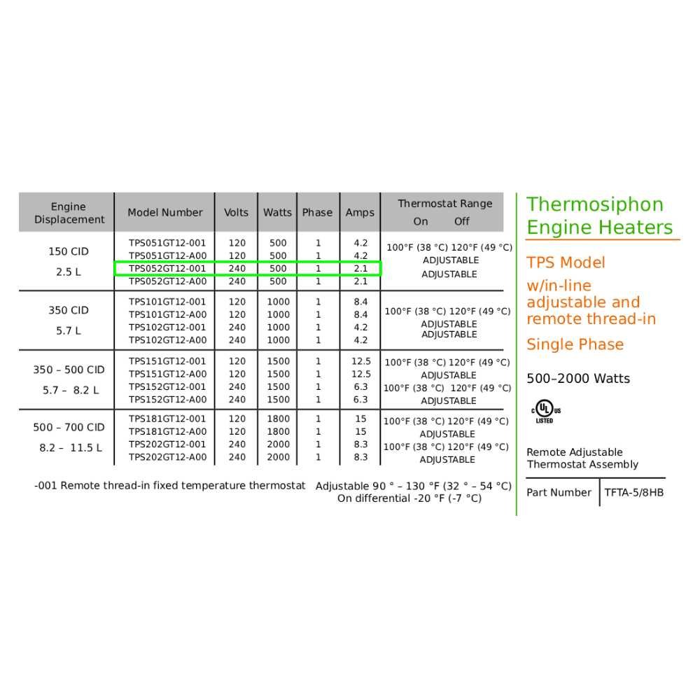 HOTSTART TPS engine heaters provide even heat distribution resulting in reduced engine wear, quick start-ups and reduced emissions. The compact design is ideal for locations that require minimal mounting space. Specs: Heating Element: Incoloy 800 Enclosure: IP41 Resists corrosion Fluid Capacity: 0.11 gal (0.42 L) Maximum Pressure: 90 psi (620 kPa) Inlet/Outlet Plumbing: 0.625” (15.9 mm) Tank Material: Polyphenylensulfid PPS L-C/US listed CE compliant. Power cord length on all models – 48” (1219mm).