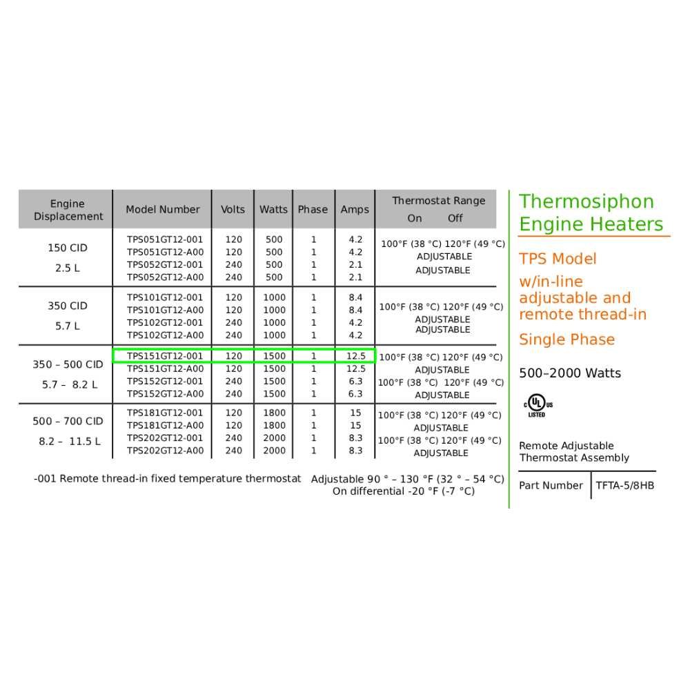 HOTSTART TPS engine heaters provide even heat distribution resulting in reduced engine wear, quick start-ups and reduced emissions. The compact design is ideal for locations that require minimal mounting space. Specs: Heating Element: Incoloy 800 Enclosure: IP41 Resists corrosion Fluid Capacity: 0.11 gal (0.42 L) Maximum Pressure: 90 psi (620 kPa) Inlet/Outlet Plumbing: 0.625” (15.9 mm) Tank Material: Polyphenylensulfid PPS L-C/US listed CE compliant. Power cord length on all models – 48” (1219mm).
