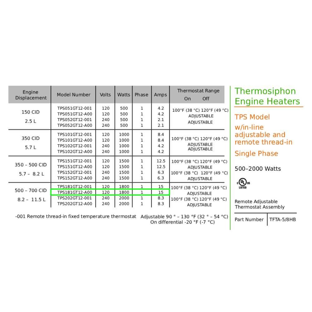 HOTSTART TPS engine heaters provide even heat distribution resulting in reduced engine wear, quick start-ups and reduced emissions. The compact design is ideal for locations that require minimal mounting space. Specs: Heating Element: Incoloy 800 Enclosure: IP41 Resists corrosion Fluid Capacity: 0.11 gal (0.42 L) Maximum Pressure: 90 psi (620 kPa) Inlet/Outlet Plumbing: 0.625” (15.9 mm) Tank Material: Polyphenylensulfid PPS L-C/US listed CE compliant. Power cord length on all models – 48” (1219mm).