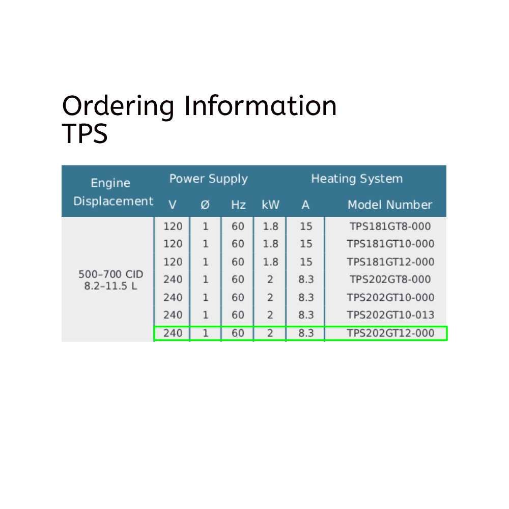 HOTSTART TPS engine heaters provide even heat distribution resulting in reduced engine wear, quick start-ups and reduced emissions. The compact design is ideal for locations that require minimal mounting space. Specs: Heating Element: Incoloy 800 Enclosure: IP41 Resists corrosion Fluid Capacity: 0.11 gal (0.42 L) Maximum Pressure: 90 psi (620 kPa) Inlet/Outlet Plumbing: 0.625” (15.9 mm) Tank Material: Polyphenylensulfid PPS L-C/US listed CE compliant. Power cord length on all models – 48” (1219mm).