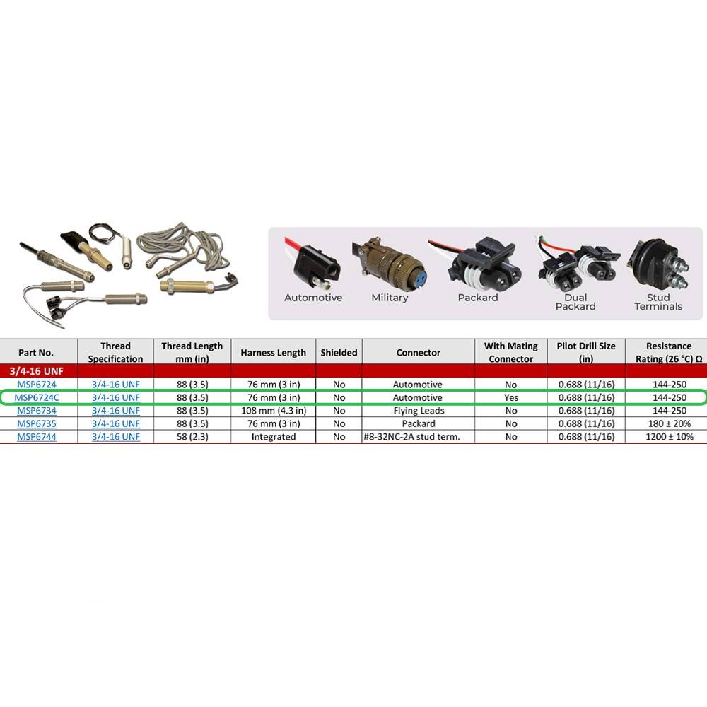 3.45 in [88 mm] Thread Length • 3 in [76 mm] Harness • Automotive Connector • Same as MSP6724 with Mating Harness CH1206 • Aluminum Gold Anodized