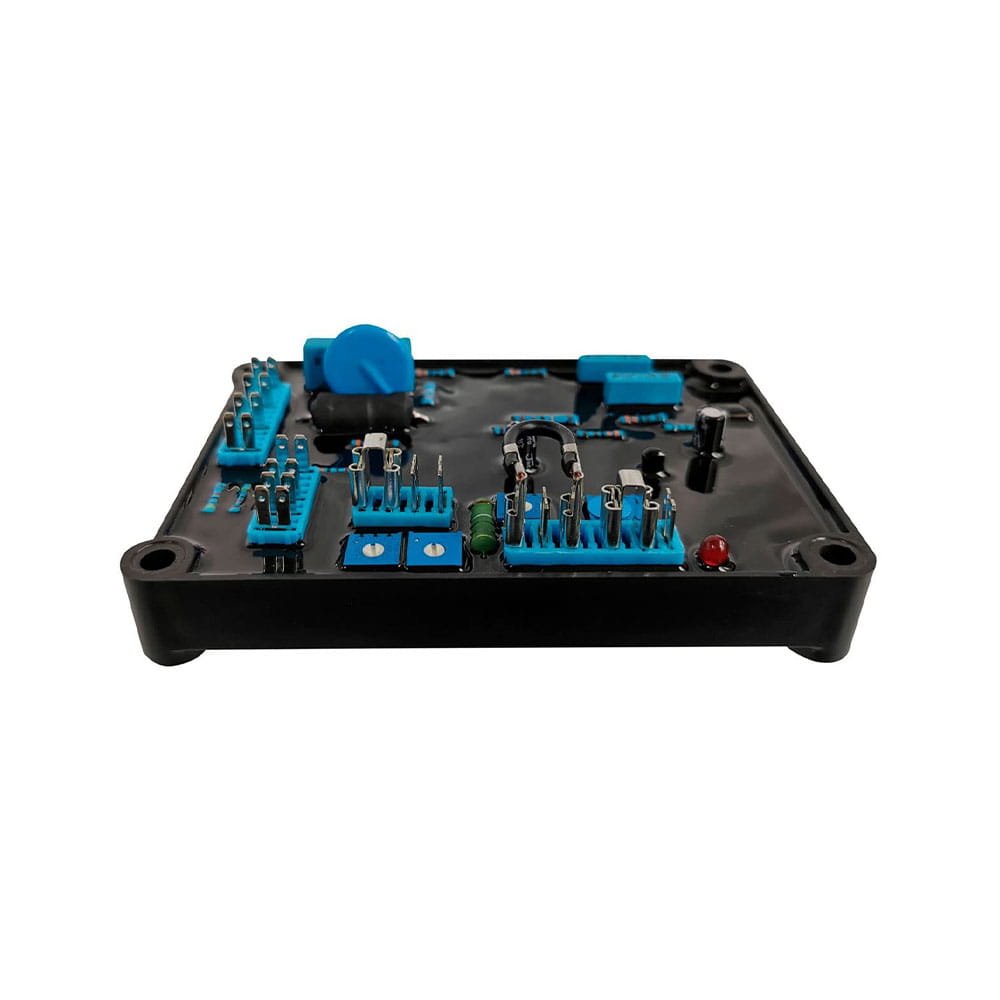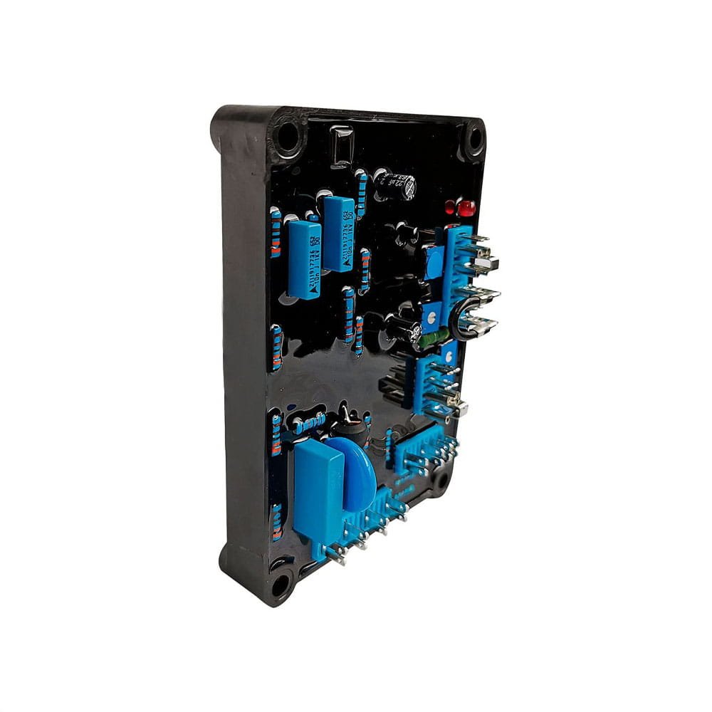 The AVR links to the main stator windings and exciter field windings to provide closed-loop output-voltage control with ±1.0% load regulation. Its voltage-sensing terminals continuously sample the output windings, and the AVR adjusts the power delivered to the exciter field—and therefore the main field—to keep the generator’s output voltage within specified limits, compensating for load, speed, temperature, and power factor changes.