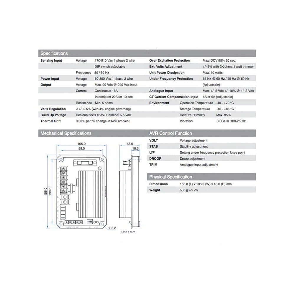 - Universal 16 Amp 1/2 Wave Self Excited Automatic Voltage Regulator can be used in parallel operation.