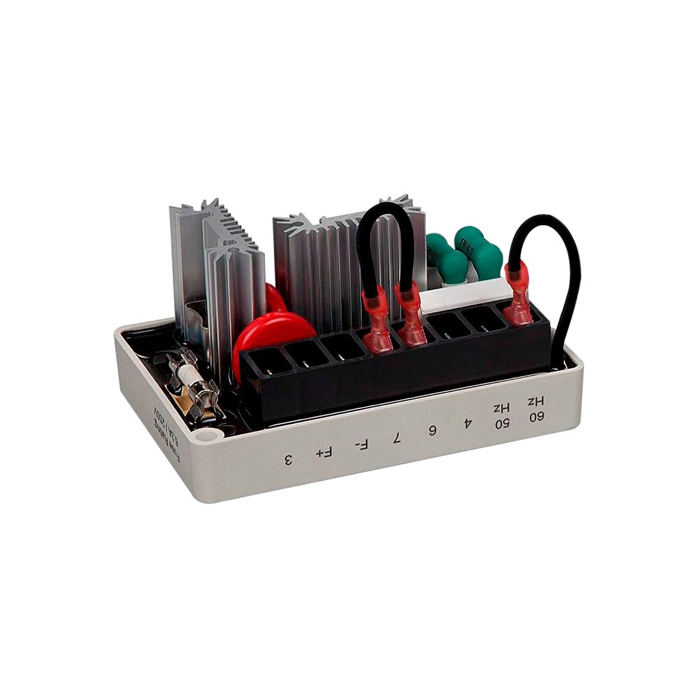 The regulator maintains voltage regulation within ±1% when paired with 4% engine governing. It allows optional 120/240 VAC sensing input and supports 50/60 Hz operation via jumper selection. The built-in under-frequency protection safeguards the system, while the high-breaking-capacity fuse and EMI suppression ensure reliable, stable performance in all operating conditions.