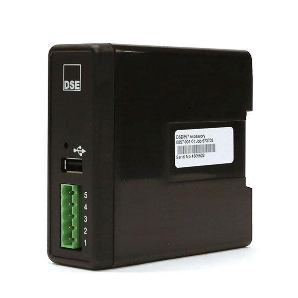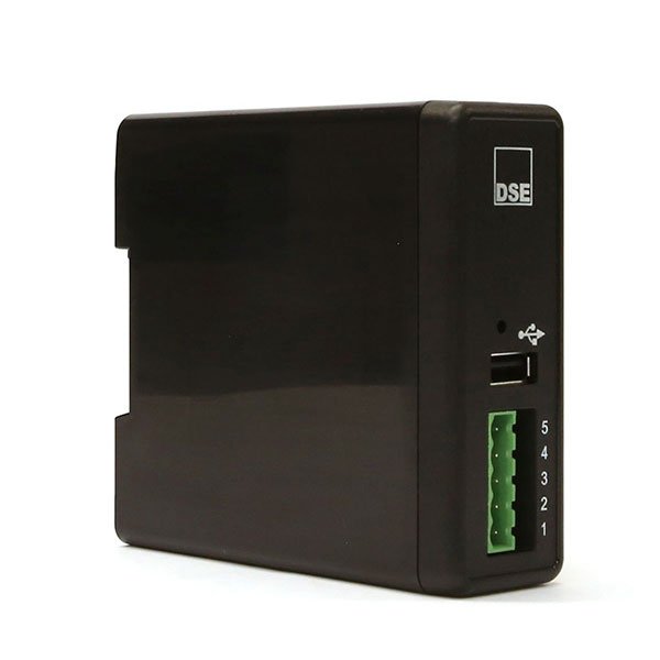 The DSE857 communications device allows monitoring of a single DSE controller with USB connectivity by converting it to an RS485 connection. To achieve this the DSE857 connects to an RS485 MODBUS RTU master over 1.2km away. The MODBUS RTU master can be an external PLC, Building Management System (BMS) or a Windows PC running the DSE Configuration Suite Software.