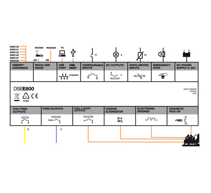 The DSEE800 engine control module provides flexible control and monitoring for engine-driven pumps, compressors, hydraulic power packs and off-highway machinery. It works with both electronic and mechanical diesel engines and offers exceptional flexibility through its integrated PLC editor, allowing users to match operating modes to their specific applications.