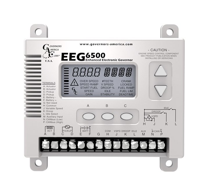 • EEG6500 (Multi-VDC / Built-In Display / Terminal Strip / Gaseous or Diesel / Works with all GAC Actuators except 2001) Improved & Simplified LCD User Interface – Fast Setup with 5 push buttons – Lockable Display to Prevent Unauthorized Access – Selectable Isochronous or Droop Governing