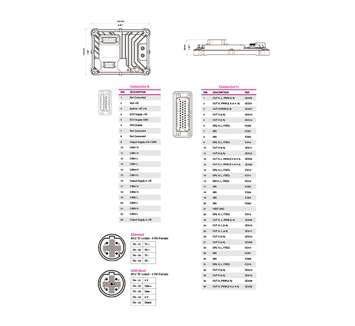 Inside the unit is a powerful 32 bit processor with a 220 MHz clock speed for outstanding operating response times. There are also 4 independent CAN interfaces, J1939, CAN Open and Raw CAN. Flexible user programming is provided via CODESYS 3.5 (C programming on request).