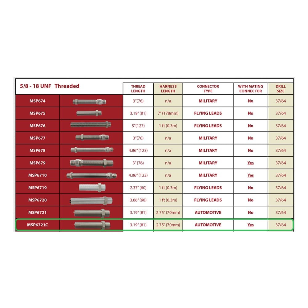 3.19 in [81 mm] Thread Length • 2.75 in [70 mm] Harness • Automotive Connector • Stainless