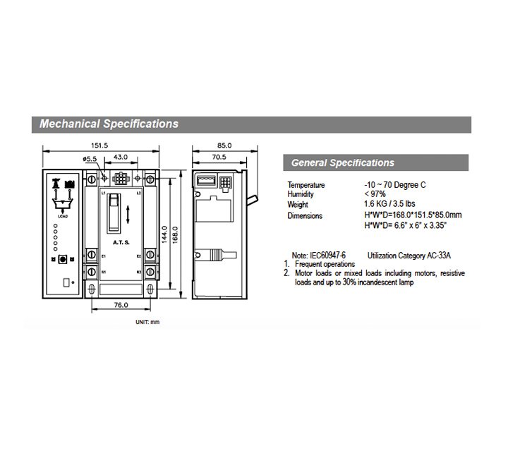 - Electrically or manually operated, mechanically held contacts – (Open Transition) with adjustable time in neutral.